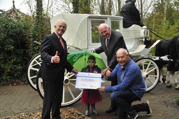 Onder een Opkikkerparaplu neemt Janiek samen met directeur Ruud Sliphorst (rechts) en voorzitter Jan Willem Termijtelen (links) van de Stichting Opkikker de cheque van € 75.000,- in ontvangst uit handen van Wiel Hillebrandt, voorzitter van de Koninklijke Facultatieve.